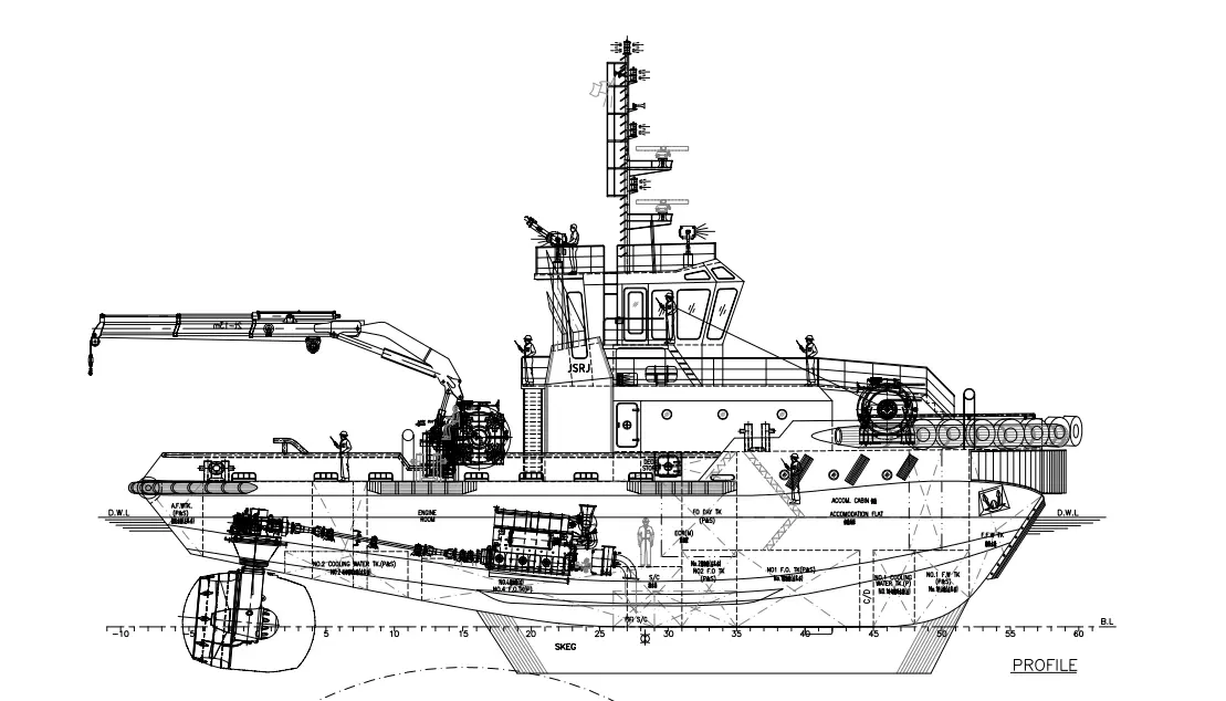 This vessel is an ASD multi-functional all-round tugboat with a bow and stern WinchTugger, Stern Roller, Shark jaw and towing pin, and 1 Crane X 2T. It is scheduled to be delivered in April 2026.
